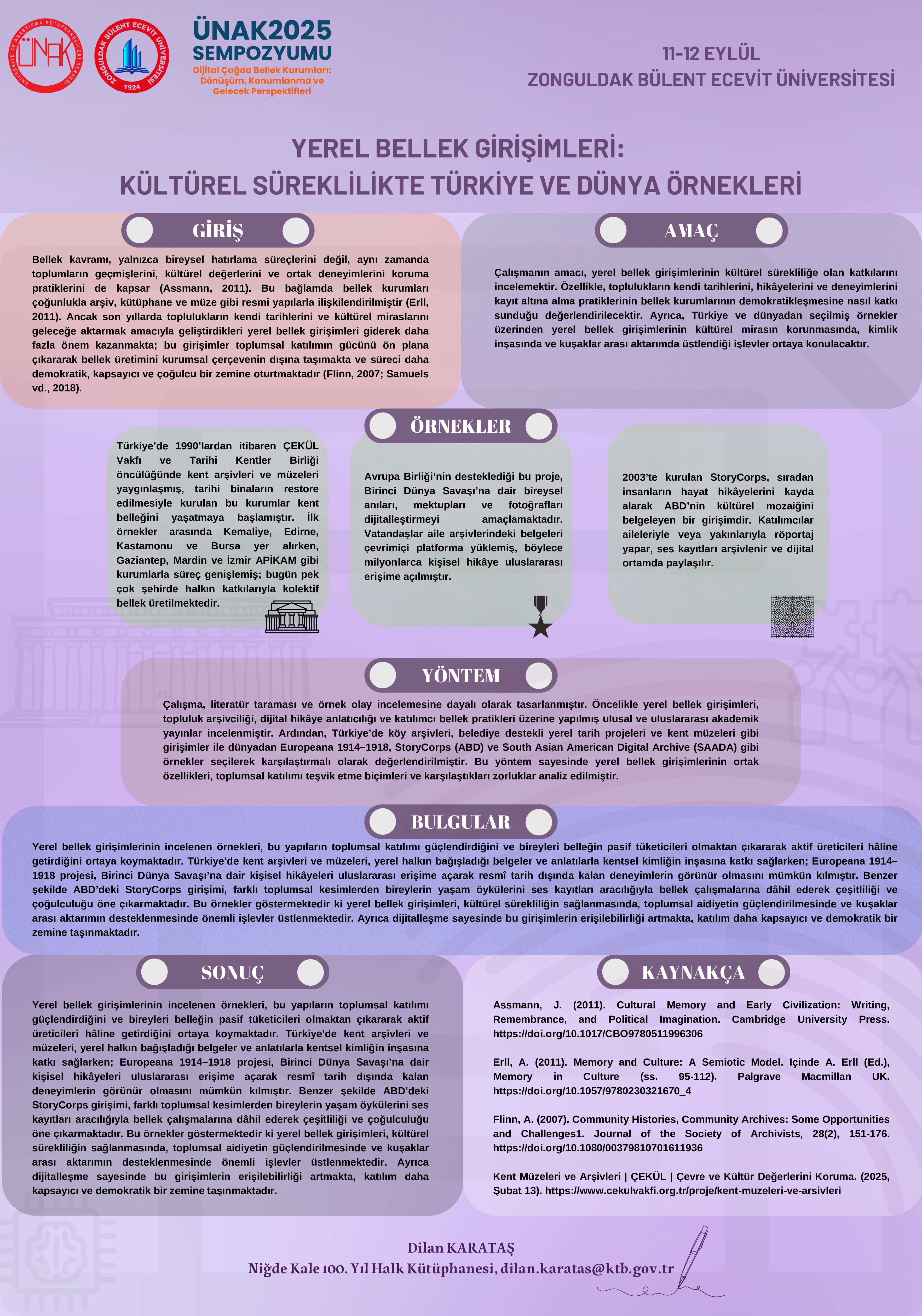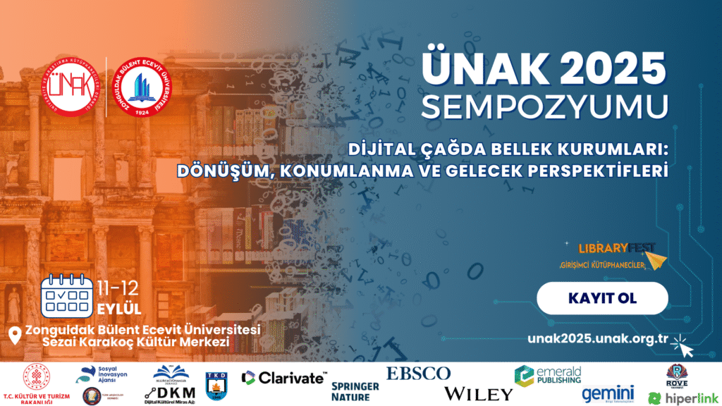 Üniversite ve Araştırma Kütüphanecileri Derneği (ÜNAK) tarafından düzenlenen ÜNAK 2025 Sempozyumu, Bu yıl “Dijital Çağda Bellek Kurumları: Dönüşüm, Konumlama ve Gelecek Perspektifleri” temasıyla 11 – 12 Eylül 2025 tarihleri arasında Zonguldak Bülent Ecevit Üniversitesi Kütüphane ve Dokümantasyon Daire Başkanlığı ev sahipliğinde gerçekleştirilecektir.